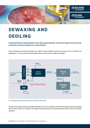 Waxes are obtained from vacuum distillate fractions or deasphalted oil (DAO) via solvent deasphalting of vacuum residue. Using the classical solvent crystallization method with MEK/toluene, a high-quality wax with an oil content below one percent can be produced from slack wax, which can also be upgraded to food-grade quality through wax hydrotreating.