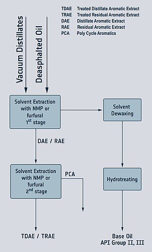 In einem ersten Extraktionsschritt werden zunächst die Aromate als sogenanntes DAE (Distillate Aromatic Extract) oder RAE (Residual Aromatic Extract) abgetrennt. Als Lösungsmittel wird NMP (oder Furfural) eingesetzt. So entstehen sehr aromatenarme Öle, die zur Herstellung hochwertiger Basisöle eingesetzt werden.