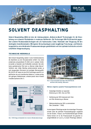 Das Solvent Deasphalting (SDA) ist eine innovative Technologie zur Entasphaltierung schwerer Raffinerierückstände mittels Lösungsmittelextraktion mit unterschiedlichen Lösungsmitteln (C3 bis C6 und Gemische) als ein- oder zweistufiger Prozess.