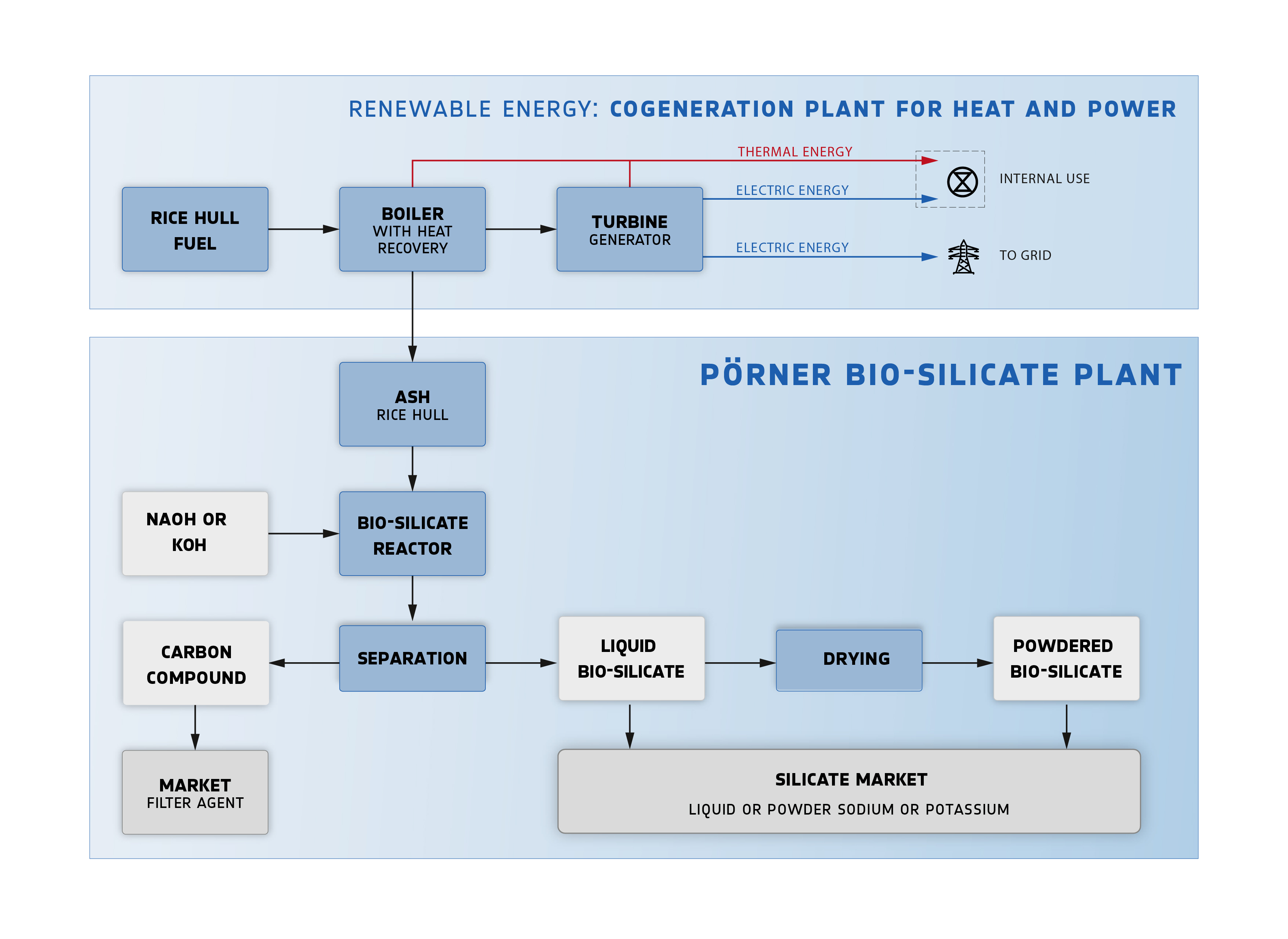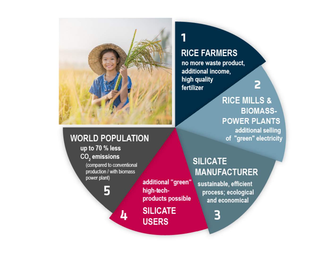 The Pörner technology converts rice hulls into climate-friendly, renewable green energy in modern, highly efficient biomass power plants. The resulting rice hull ash contains approximately 90% silicon dioxide (SiO₂), which is processed further in the Pörner silicate plant into high-quality circular bio-silicate.