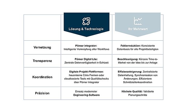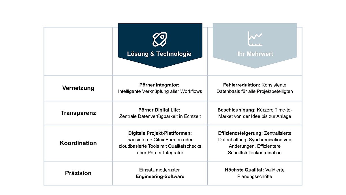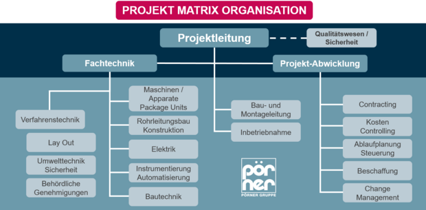 Die Pörner Matrix bietet Ihnen ein durchdachtes, zweischichtiges Konzept für die erfolgreiche Projektrealisierung. Sie vereint organisatorische Führung und ingenieurtechnische Expertise und garantiert einen reibungslosen, schnellen Anlagenbau. Mit uns entsteht Ihre Anlage – präzise geplant, wirtschaftlich optimiert und aus einem Guss.