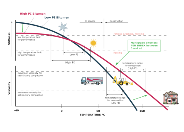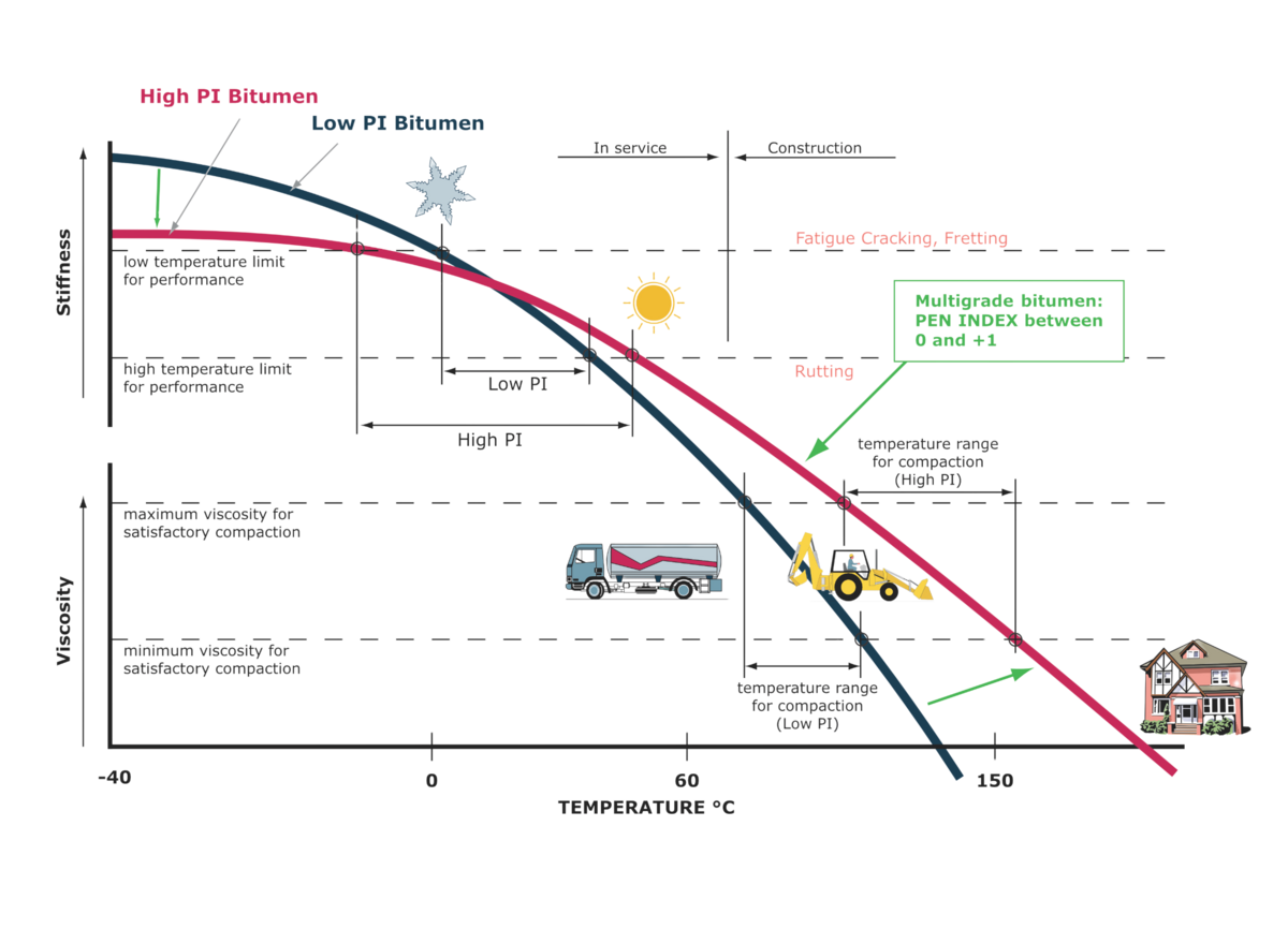 - Compared to straight-run bitumen, Biturox® bitumen has a flatter viscosity curve and a higher PEN index. This makes it more resistant to highly variable climatic conditions.