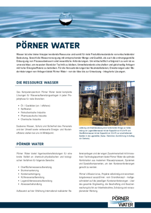„Pörner Water“ bietet Ihnen bei Neuinstallationen, Erweiterungen oder Modernisierungen von Anlagen ganzheitliche Lösungen. Dabei stehen sauberes Wasser, Schutz und Sicherheit des Personals und der Umwelt sowie verbesserte Energie- und Kosteneffizienz der Gesamtanlage im Fokus.